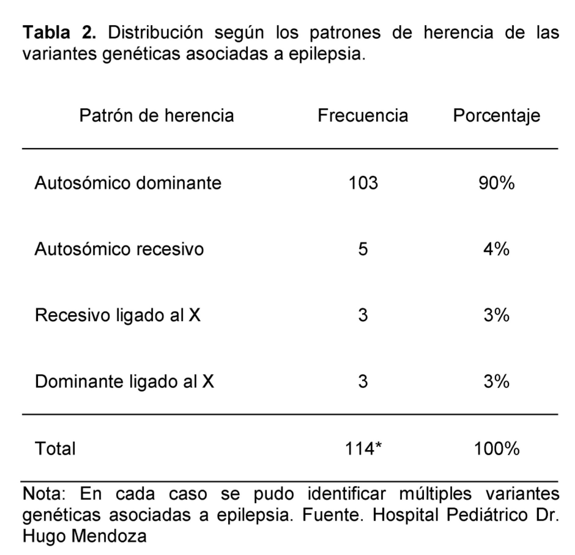 The inheritance patterns of the most frequent genetic variants associated with epilepsy were analyzed, and we determined that the autosomal dominant inheritance pattern was presented, followed by the autosomal recessive pattern and finally the X-linked inheritance patterns; recessive and dominant. It should be noted that the sample size is a fundamental axis to validate the frequency of these inheritance patterns with respect to other investigations.
