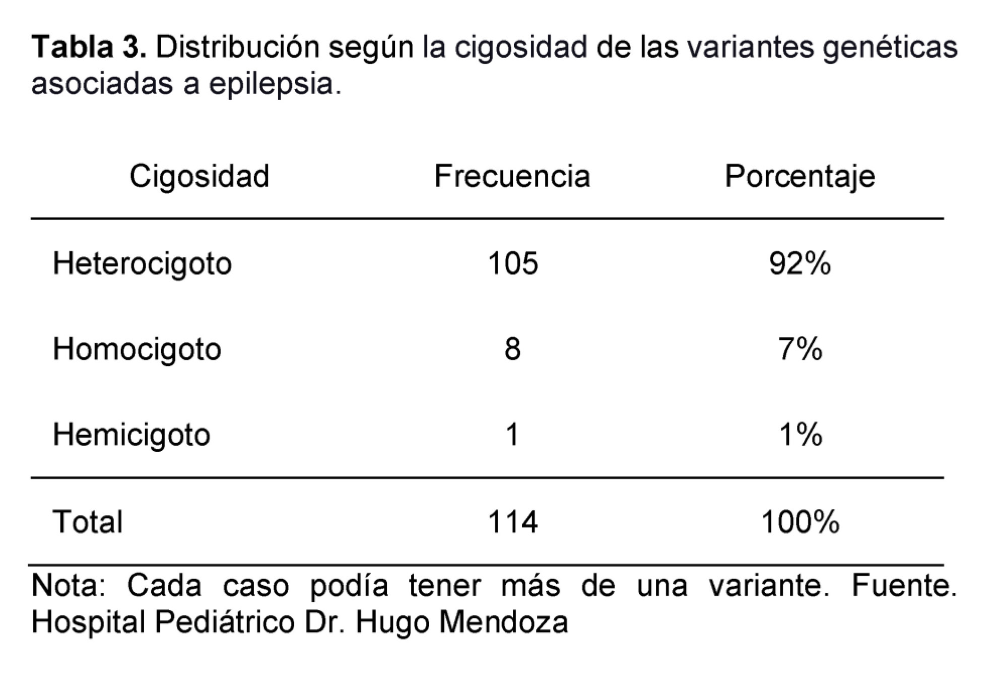 Our research was able to establish the zygosity of the variants associated with epilepsy, in such sense our findings were consistent with patients in heterozygous state, presenting a total of 105 cases of variants, the homozygous with 8 cases, and finally the hemizygous with 1 case.