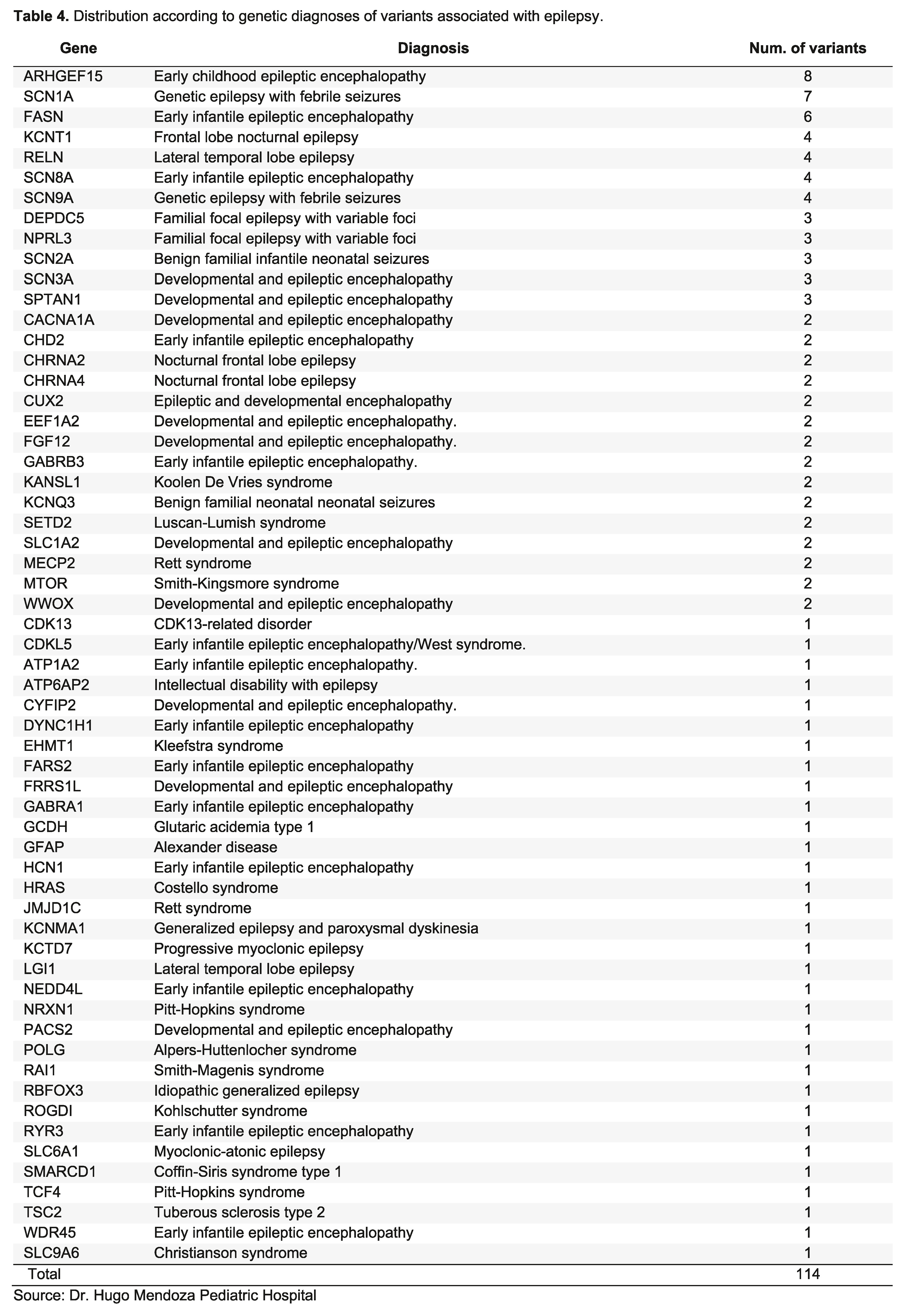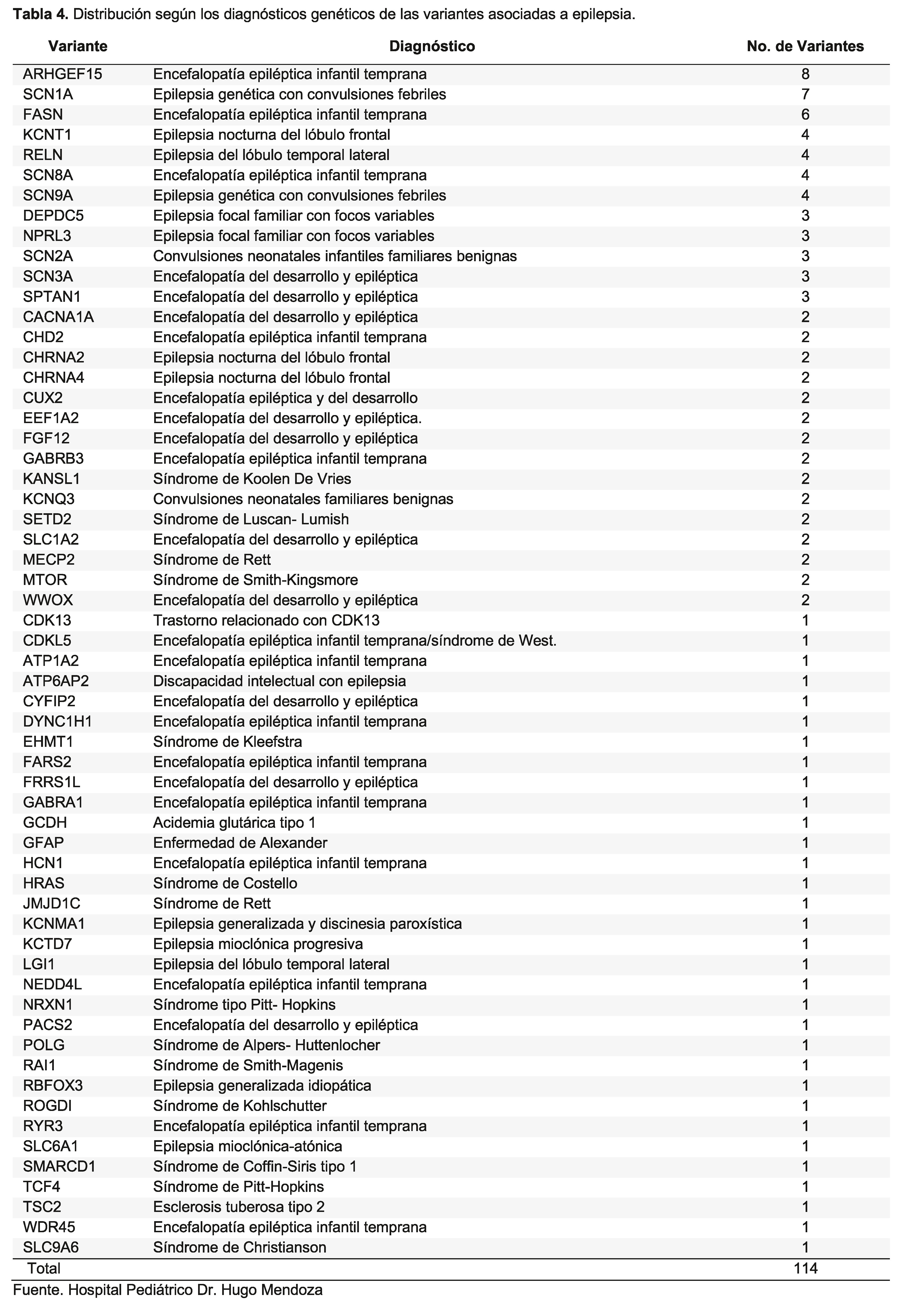 The data were organized in decreasing order using the number of cases, by means of a frequency table. We analyzed the number of times a variant was presented in relation to the total number of cases presented. With the analysis of these 114 cases we determined the most frequent genetic variants associated with epilepsy in our population, which corresponded to ARHGEF15, followed by the SCN1A variant, continuing with the FASN variant, and finally the variants KCNT1, RELN, SCN8A and SCN9A.