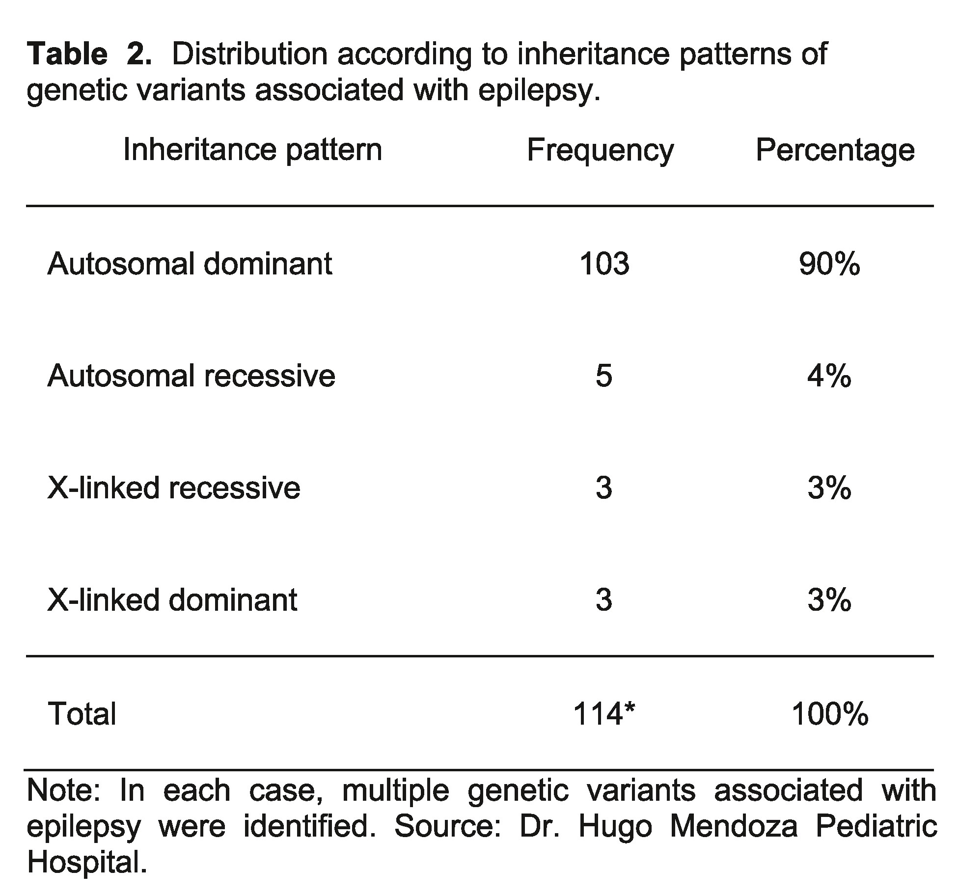The general objective of this work is to determine the frequency of genetic variants associated with epilepsy in our population. Specifically, we wish to identify the most frequent age and sex of the genetic variants associated with epilepsy (See Supplementary Table 2). The inheritance pattern of the genetic variants associated with epilepsy is also determined. Likewise, the molecular diagnosis and the zygosity of the genetic variants found are established.