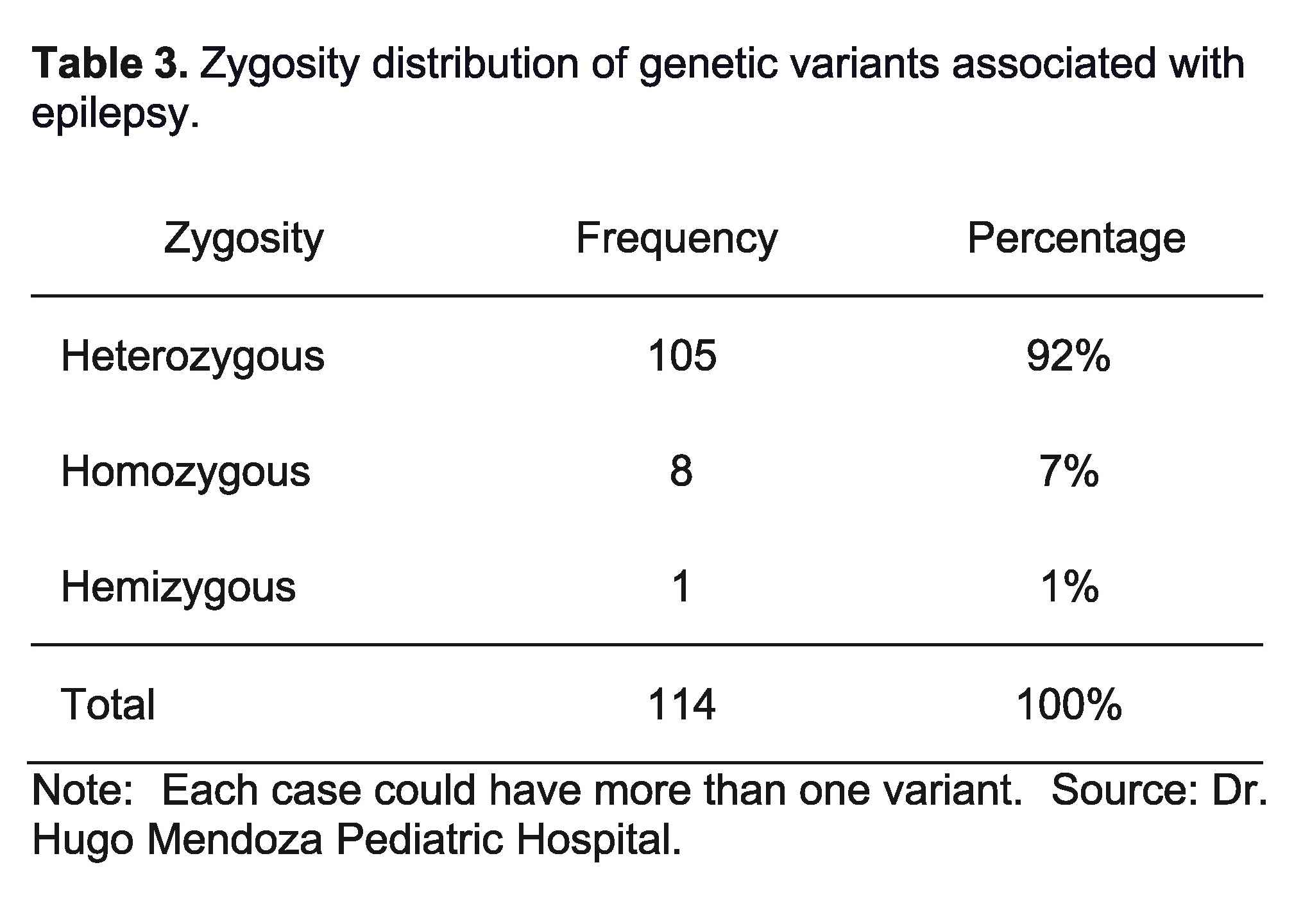 In the journal Epilepsia, official journal of the International League Against Epilepsy. Krishna R Veeramah, Laurel Johnstone et al. In 2013, they concluded that 70% of their patients presented heterozygosity and 30% homozygosity. This differs from our study, where 92% of the variants correspond to heterozygosis and 7% to homozygosis, in addition to the fact that they did not present hemizygotes, which represent 1% respectively in our research.