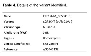 FHL can be divided into five subtypes according to the causative genetic variant. Variants involving PRF1 and UNC13D are the most pathogenic [7]. Worldwide, 58% of FHL patients have variants of the PRF1 gene [4]. Pathophysiologically, the main underlying defect was identified to be altered T cell and NK cell cytotoxicity [1]. Patients carrying defects in the PRF1 gene are vulnerable to infections, autoimmune diseases and malignancies [12]. The main clinical features are persistent fever, hepatosplenomegaly, pancytopenia and decreased NK cell activity [9,10]. To make the diagnosis, the HLH probability calculator (HScore) is in use, which takes into account 9 criteria, with a sensitivity of 93% and a specificity of 86% [13]. As a confirmatory method, the use of a multigene panel or genomic tests are included. The former, includes the analysis of genes involved in known FHL types, such as PRF1, UNC13D, STX11 and UNC18B [17].