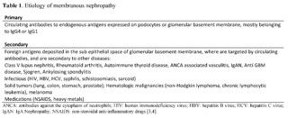 The exact cause of primary membranous nephropathy is often idiopathic (unknown) in about 70% of the cases. However, certain secondary causes and associations that have been identified include autoimmune diseases (systemic lupus erythematosus); autoimmune thyroid disease; infections like hepatitis B or C; medications like nonsteroidal anti-inflammatory drugs, penicillamine; malignancies as solid tumors and hematologic malignancies and others as described in Table 1.