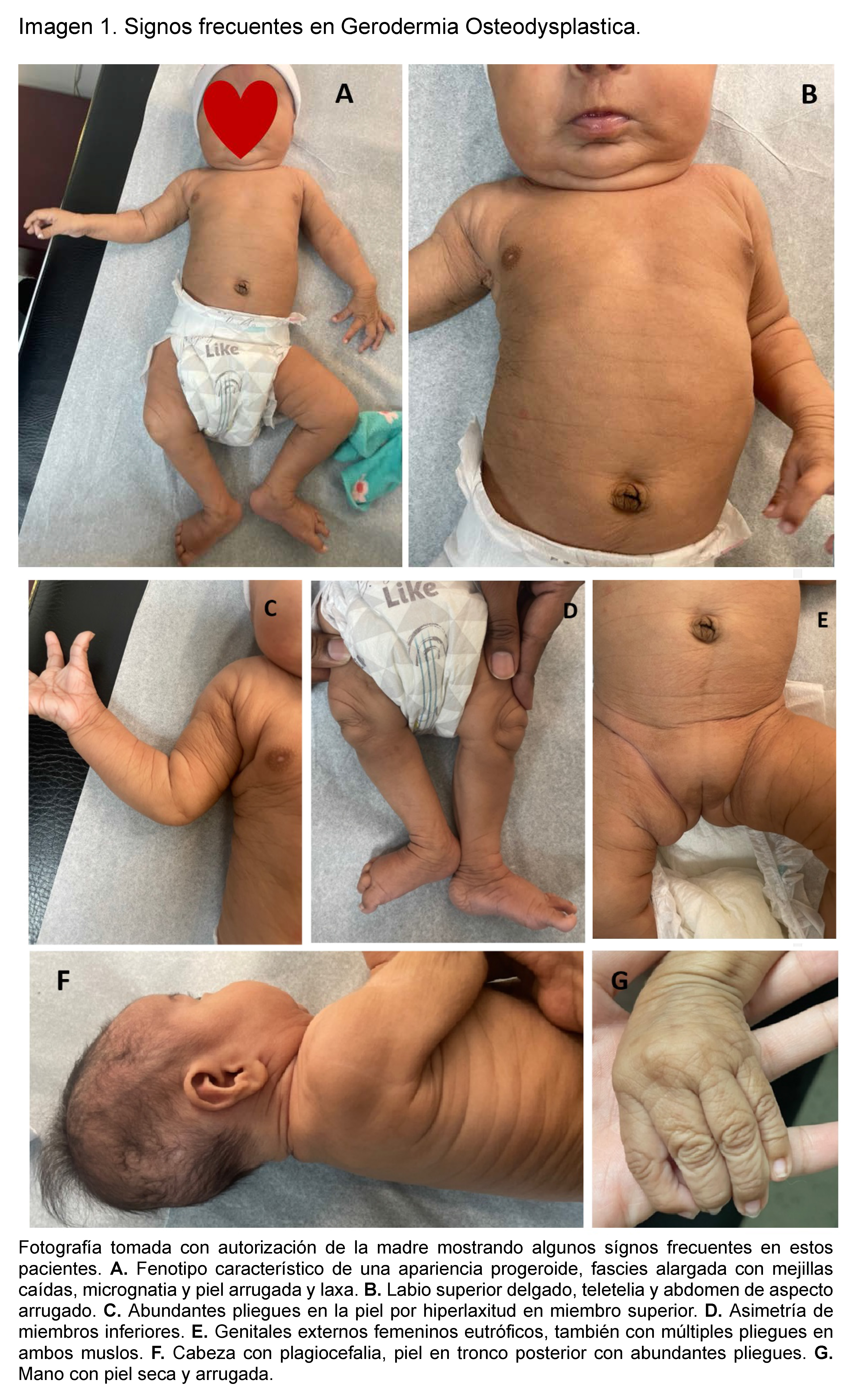 Infant under 3 months of age, female, first child of a 15-year-old adolescent mother, who had 2 prenatal check-ups, no infections or complications during pregnancy, parents not related by blood according to the mother, family history denied. The patient was born at 40 weeks of gestation, via vaginal delivery without complications. APGAR 9/9, birth weight 2.6 kg. During her initial evaluation they noted a lax, loose and redundant skin, giving the impression of an aged skin appearance, in addition to long fingers. The patient was discharged with her mother.