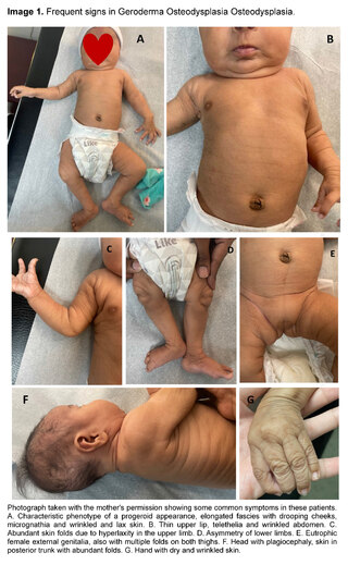 ABSTRACT: Gerodermia osteodysplastica (GO) is a rare genetic disease in which the inheritance is autosomal recessive within Cutis laxa disorders, it is characterized by a lax and wrinkled skin, osteoporosis leading to spontaneous fractures, congenital dislocation of the hips, hyperextensible joints, progeroid features, developmental delay and intellectual deficit. This is a condition caused by genetic mutations in the GORAB gene (1q24.2). We present the case of a 3-month-old infant with the typical phenotype of this condition, lax and wrinkled skin, specially the hands and feet, in addition to a knee dislocation. A panel testing for connective tissue disorders was performed, which identified an alteration in the GORAB gene, confirming the diagnosis de Gerodermia osteodysplastica.
