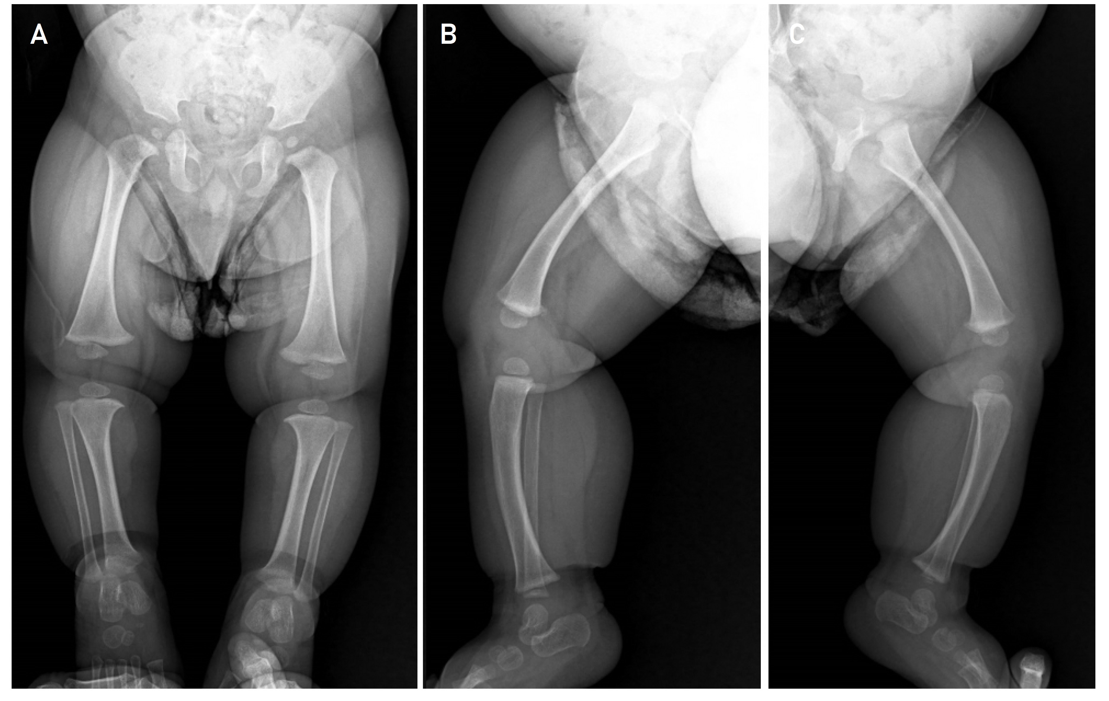 This is a 2-year-old male infant, first child of non-consanguineous parents, with no relevant history of pregnancy and delivery at term and without complications, who is referred to the Genetics consultation by his pediatrician for severe short stature (- 5DS), and with an ongoing diagnostic suspicion process for skeletal dysplasia. The patient has two paternal half-siblings (Figure 1). On physical examination the patient had mild dysmorphologic findings including midface hypoplasia, flat nasal bridge, relative macrocephaly, frontal bossing, brachydactyly and lordosis (Figure 2). Radiographic evaluations at 11 months of the entire skeleton revealed as the only notable finding cup widening of both femurs with discrete longitudinal shortening of both tibias with anteroposterior curvature suggestive of bone dysplasia (Figure 3), and with a bone age study, which revealed an advanced bone age for the age of 1 year and 3 months (4 months). The patient received early stimulation due to the detection of a slight delay in psychomotor development with hypertonia, and at one year of age he was meeting all the developmental milestones. Molecular genetic testing was performed in the evaluation process.
