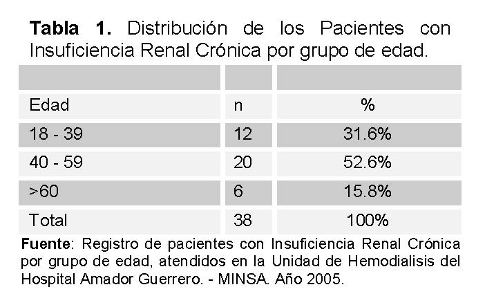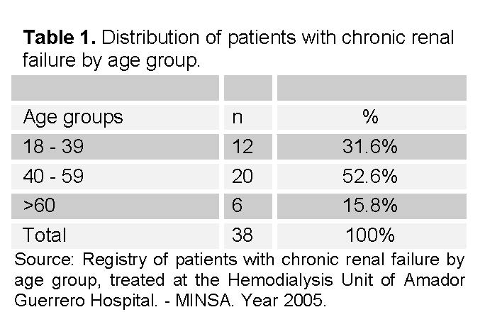 The studied population of 38 patients consisted of patients already diagnosed with CRF, mostly in the age group of 30 to 59 (See Table 1). This group represented 52.6% of the cases. This was followed by the group of 18 to 39 years, representing 31.6% of the studied group. Finally, the group over 60 years represented 15.8% of the studied cases.