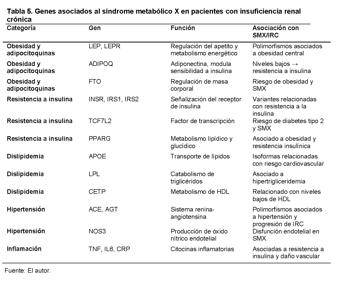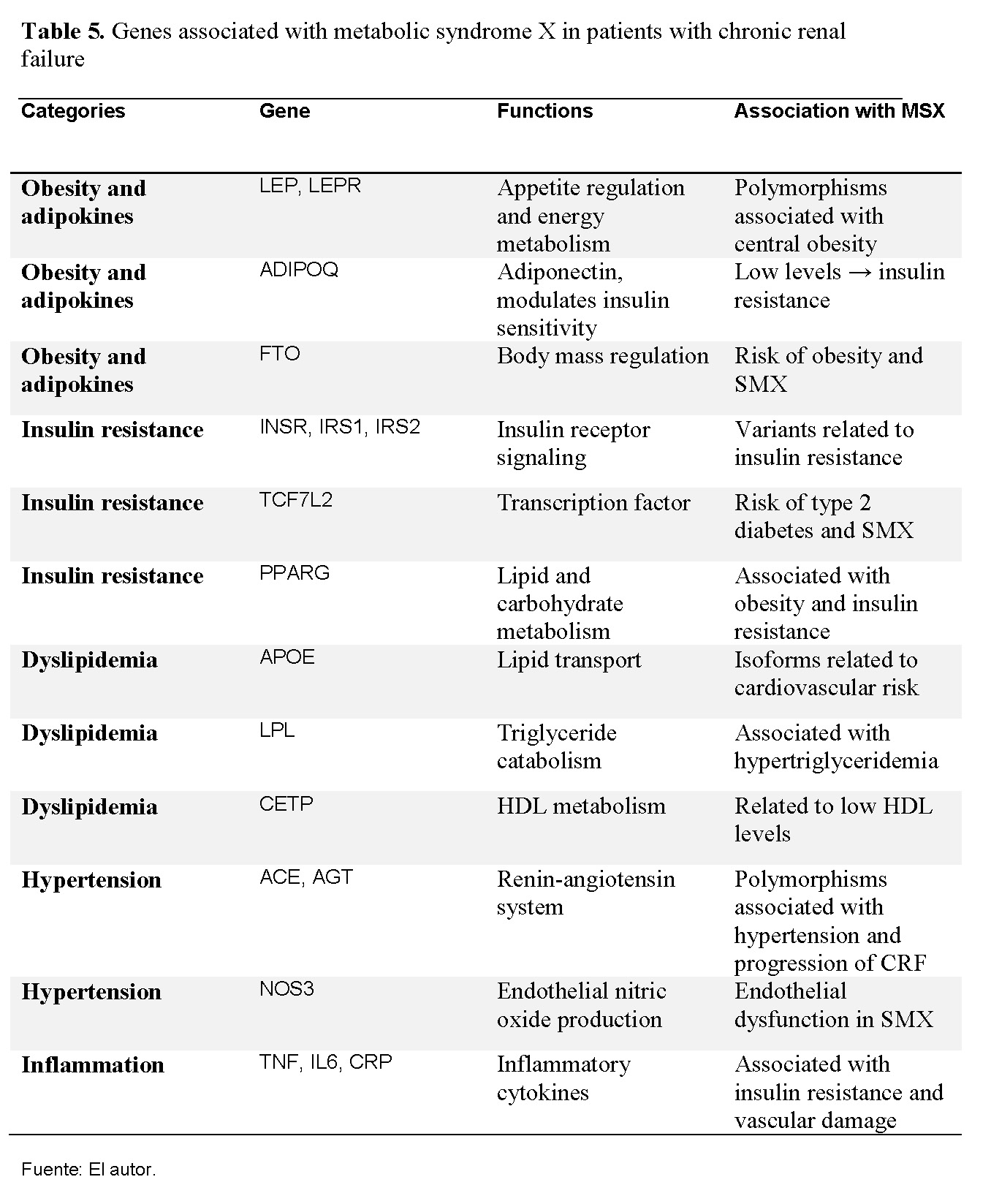 Although it is recognized that external factors such as a sedentary lifestyle, inadequate diet, overweight, and quality of life are determinants in the onset of metabolic syndrome X (MSX), evidence suggests that genetic factors also play a fundamental role in the development of this constellation of clinical conditions. MSX is not limited to the simple coexistence of abdominal obesity, arterial hypertension, dyslipidemia, and insulin resistance, but reflects a complex interaction between environment and genetic predisposition, where individual variability in genes associated with energy metabolism, inflammation, and vascular regulation can explain why some patients with similar lifestyles have a greater susceptibility to developing the disease. In fact, evidence in the scientific literature has identified that polymorphisms in genes such as LEP, ADIPOQ, INSR, IRS1, TCF7L2, PPARG, APOE, LPL, CETP, ACE, AGT, NOS3, TNF, IL6, among others, contribute to the genetic susceptibility to MSX in renal patients (See Table 5) [9].