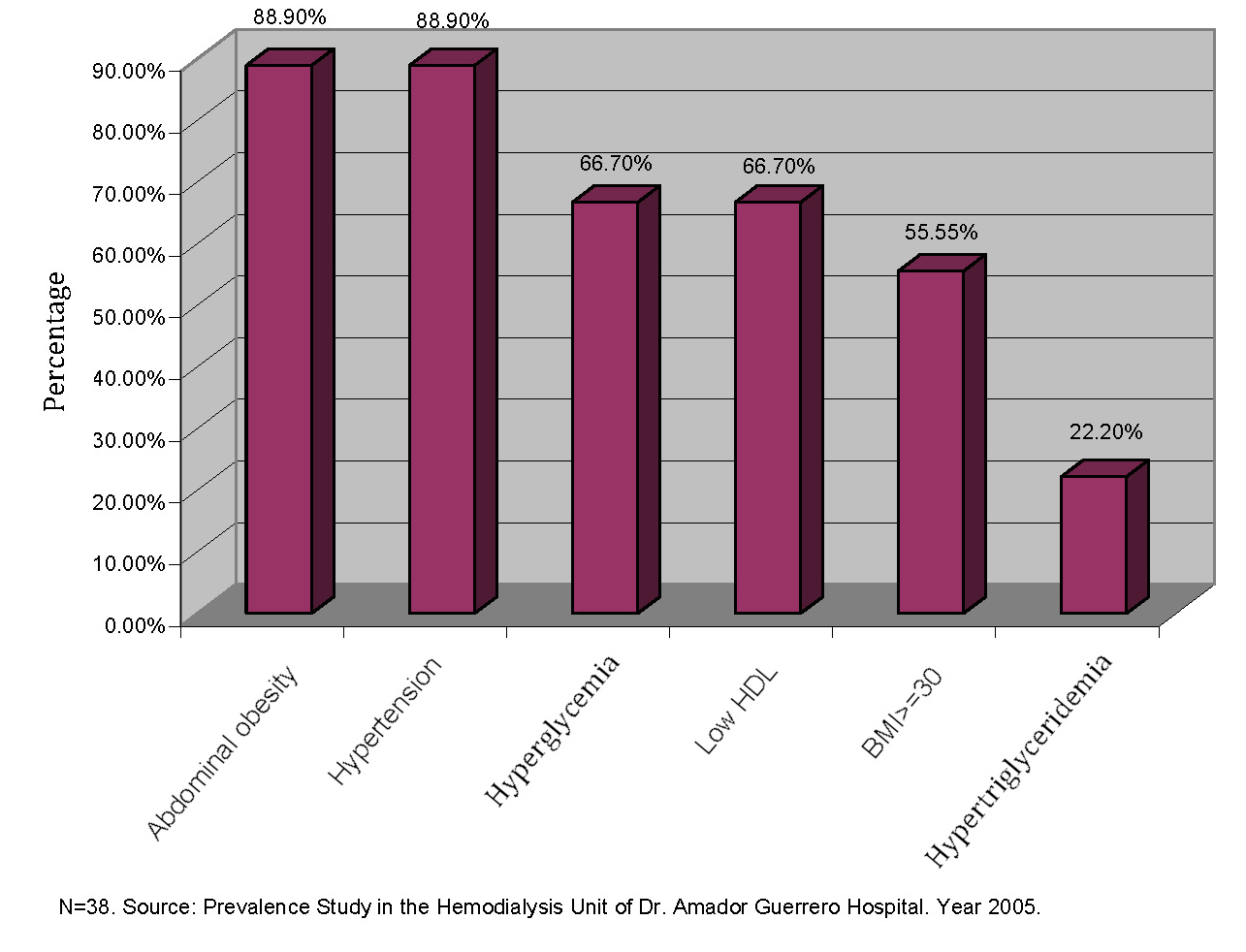 The study universe consisted of the population of the province of Colón (127,582 inhabitants), and the sample included all patients treated with dialysis for chronic renal failure (CRF) during the year 2005. All patients on hemodialysis or peritoneal dialysis in the Hemodialysis Unit at Amador Guerrero Hospital with a previous or established diagnosis of CRF during the year 2005 were included, and those who entered after 2006 or had undergone a kidney transplant were excluded. Data were collected over a three-month period, covering both hospital unit patients and private hemodialysis units in the province. After obtaining informed consent, anthropometric parameters such as dry weight, abdominal circumference, and height were recorded, taking averages of the measurements. Laboratory data corresponding to the months of January, June, and December were extracted from clinical records, including age, fasting glucose, blood pressure, and lipid profile (total cholesterol, LDL, HDL, and triglycerides). For the diagnosis of metabolic syndrome X, the NCEP/ATP III (2005) criteria were used, which establish the presence of at least three of the following factors: abdominal obesity (>120 cm in men and >80 cm in women), hypertriglyceridemia (>150 mg/dl), low HDL cholesterol (<40 mg/dl in men and <50 mg/dl in women), hypertension (≥130/85 mmHg), and elevated fasting glucose (≥100 mg/dl). Finally, the data were tabulated in Microsoft Excel and subsequently exported to EPI-INFO 6.0 for statistical analysis and significance testing.
