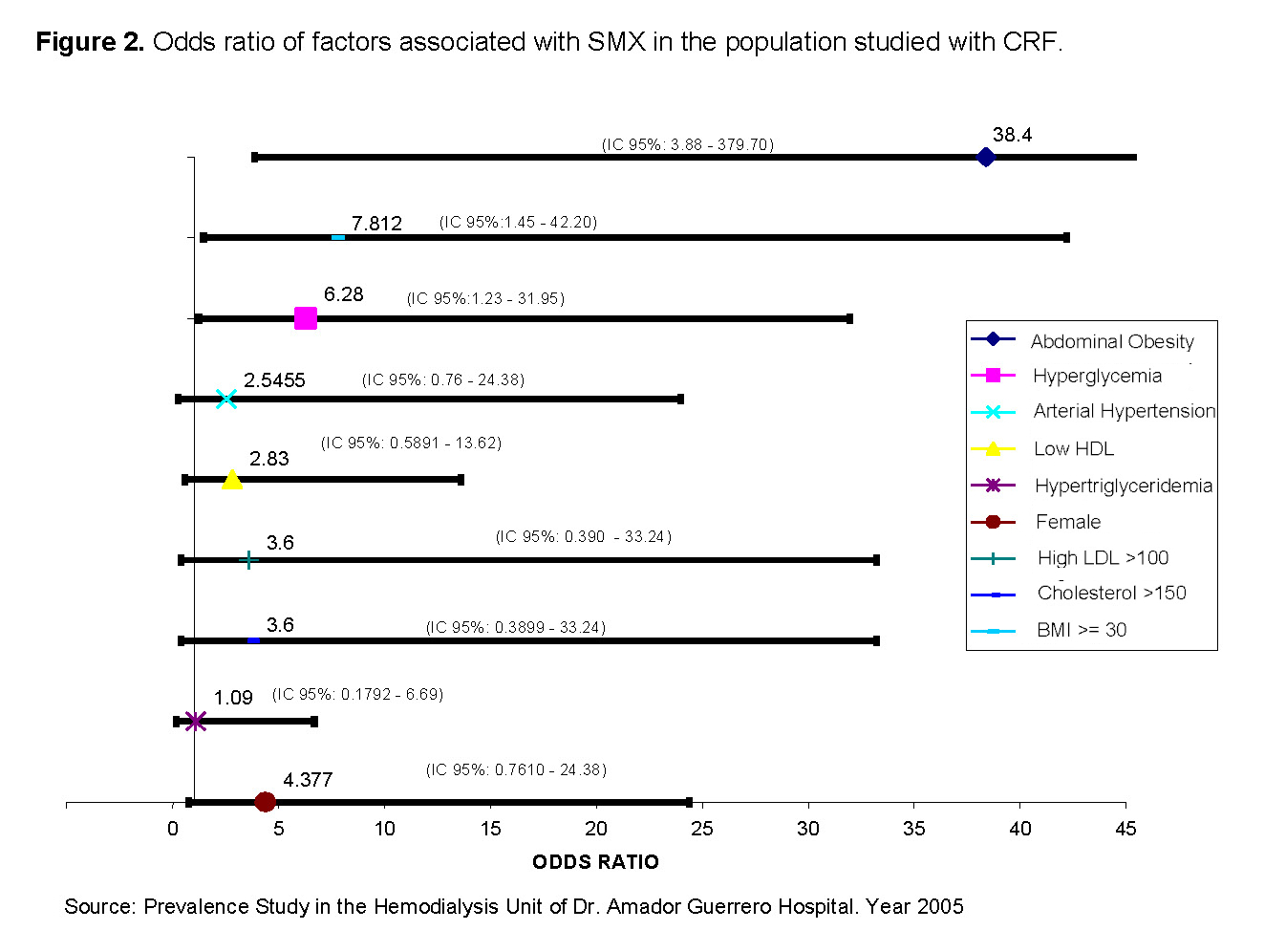 The results obtained show a clear hierarchy in the strength of association of the factors studied with the presence of metabolic syndrome X (MSX). Abdominal obesity presented an OR of 38.4, meaning that patients with this finding are 38 times more likely to develop MSX compared to those without abdominal obesity. This extremely high value highlights abdominal obesity as the most important and determining risk factor in this cohort of patients with chronic renal failure (CRF).