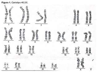 A las 39.2 semanas de gestación, nació una recién nacida de sexo femenino con un peso de 3,310 gramos y una talla de 52 cm, con una adaptación neonatal adecuada. Durante el primer mes de vida, se identificaron los siguientes hallazgos fenotípicos: estrabismo derecho, proptosis derecha, hiperostosis de la sutura coronal derecha, deformidad craneofacial, aplanamiento frontal derecho y aumento del tamaño del hallux bilateral. Se solicitaron estudios de citogenética y de imágenes diagnósticas. Se le realizó un cariotipo de bandas G, en el cual se realizó un análisis de 25 metafases a una resolución de 400 - 500 bandas, donde revela una constitución cromosómica 46,XX sin alteraciones estructurales evidentes (Figura 1). Así mismo, dada la asimetría craneal por deformidad fronto - orbitaria derecha, se realiza la confirmación radiológica de craneosinostosis, lo cual lleva a la indicación de corrección quirúrgica.