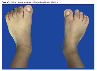 En relación con el desarrollo facial, la hipoplasia del tercio medio facial contribuye a un rostro aplanado, lo que favorece el desarrollo de órbitas poco profundas y fisuras palpebrales [13]. El subdesarrollo de las estructuras maxilares da lugar a una maloclusión de clase 3, una característica universalmente observada, y a un prognatismo mandibular. Estas alteraciones se asocian con exorbitismo, estrabismo, hipertelorismo, pabellón auricular de implantación baja, y una estructura nasal de pequeñas dimensiones con punta bulbosa [14,15]. Sin embargo, la paciente únicamente manifestó entre otras anomalías estrabismo derecho, proptosis derecha, y aumento del tamaño del hallux bilateral.