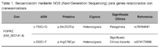 Ante la sospecha de síndrome de Pfeiffer, se solicita un panel molecular de 38 genes para craneosinostosis (Tabla 1), en el que se identifica una variante heterocigota patogénica en el gen FGFR2 (cambio de citosina por guanina en la posición 755 del ADNc, en el exón 7, produciendo un cambio de sentido erroneo (missense) de serina por triptófano en el aminoácido 252). También se encuentra una variante de significado incierto en el mismo gen (cambio de citosina por timina en la posición 532 del ADNc, en el exón 5, que a nivel de la proteína produce un cambio de sentido erronea (missense) de arginina por cisteína en el aminoácido 178).